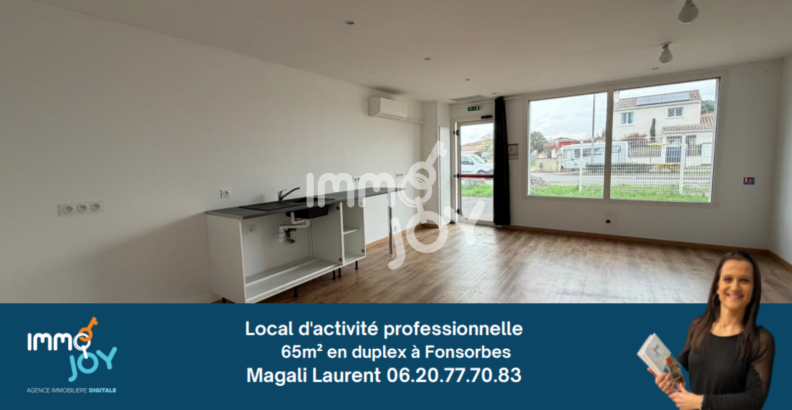 Contactez Magali LAURENT, IMMOJOY Fonsorbes de 9h à 21h tous les jours pour accéder à la location de ce local d'activité professonnelle climatisé baigné de lumière grâce à une grande vitrine.