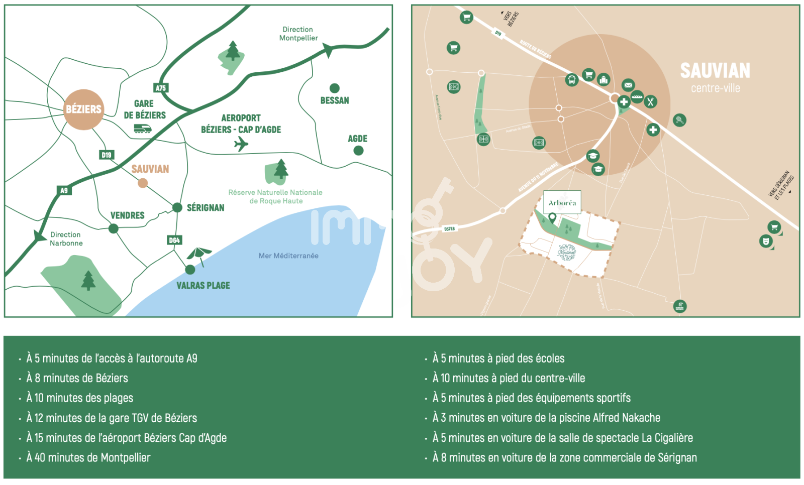 Aux portes de Béziers et à 5 kilomètres de la Méditerranée, SAUVIAN profite d’un emplacement géographique exceptionnel, entre terres agricoles et vignobles.