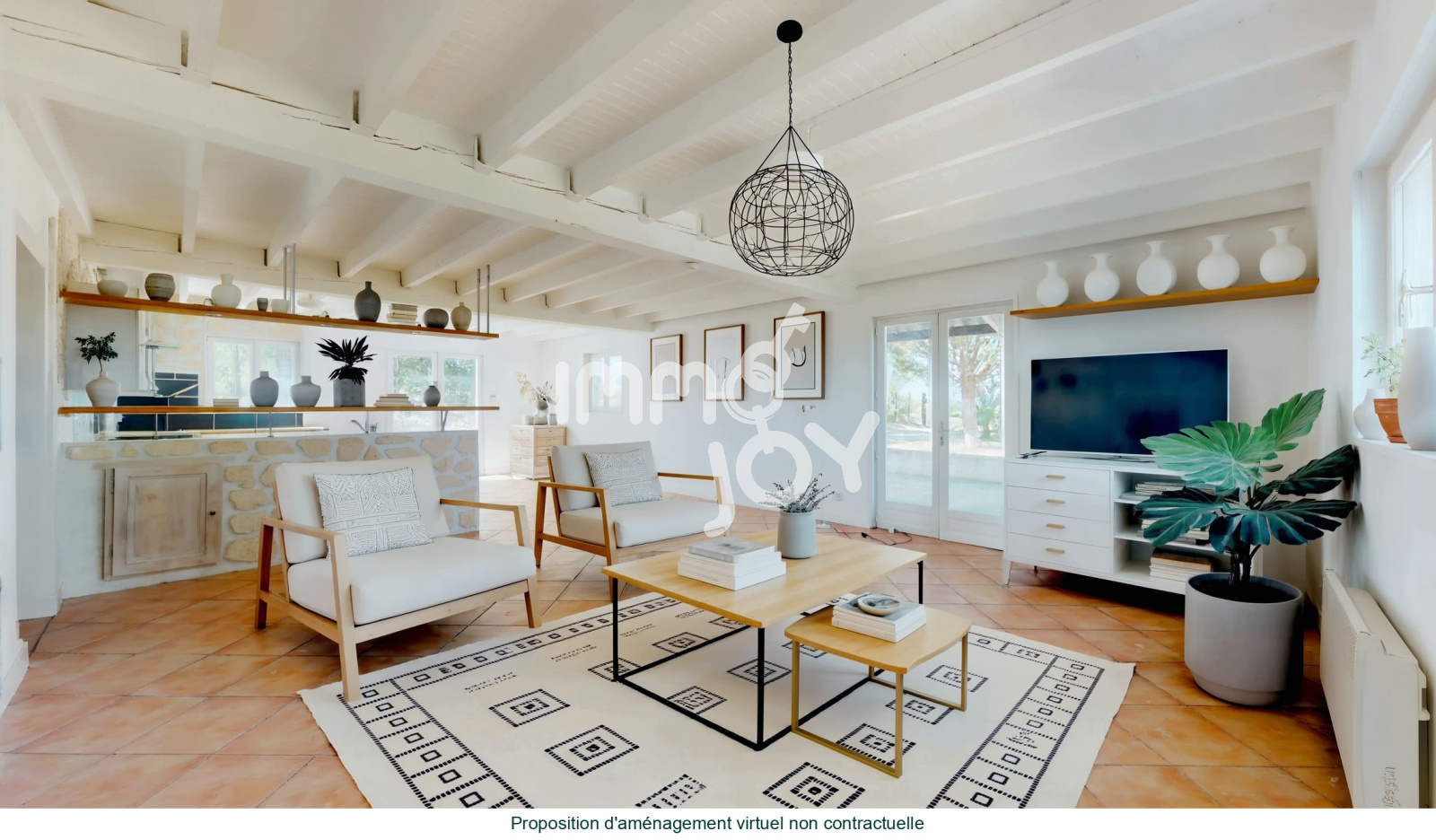Au Rez-de-chaussée : Une grande pièce de vie lumineuse avec une cuisine ouverte donnant sur une terrasse couverte, un cellier, une salle de bains avec douche.