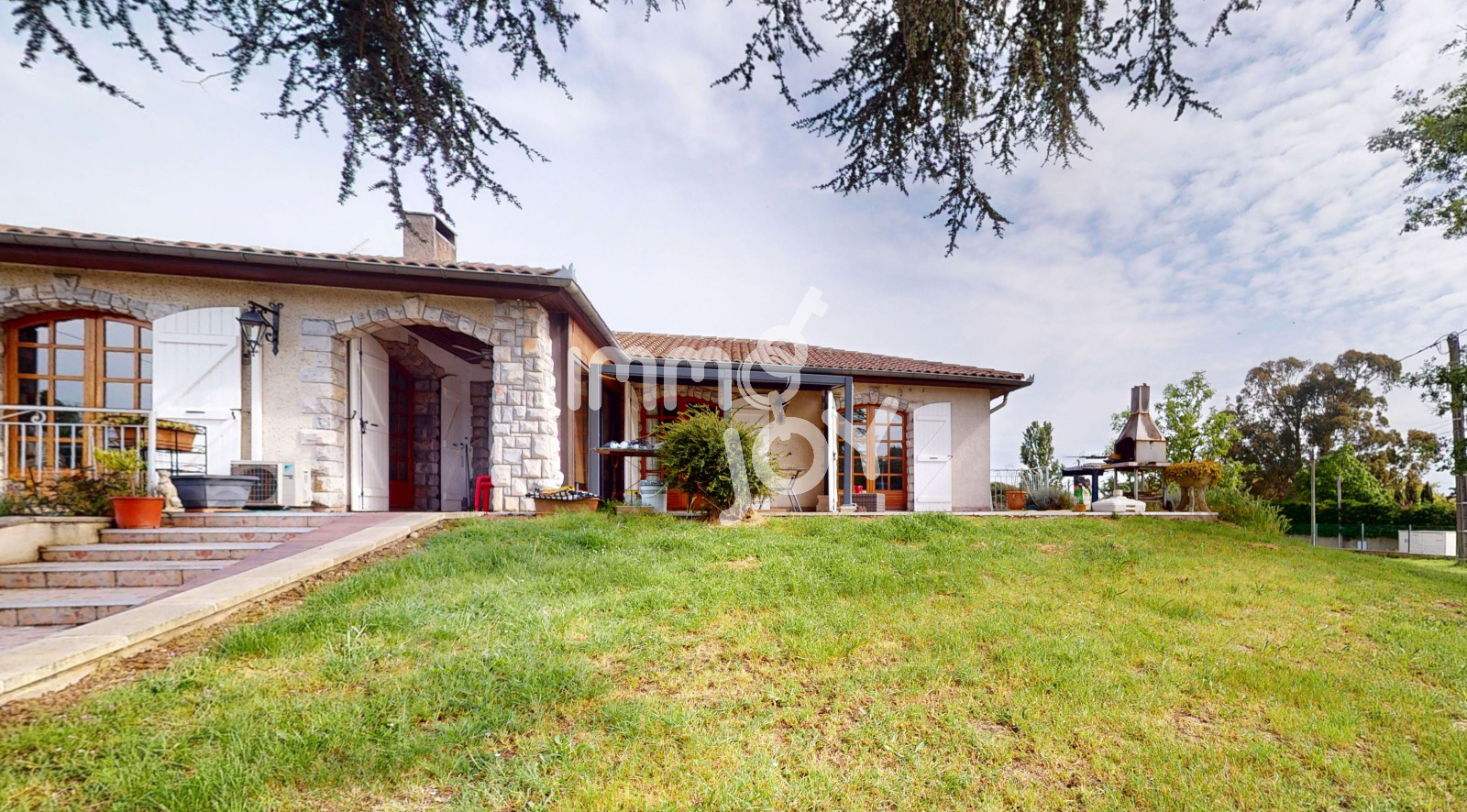 À l'extérieur, nous retrouvons une grande et belle terrasse donnant sur un terrain spacieux, une belle vue dégagée et sans vis à vis.